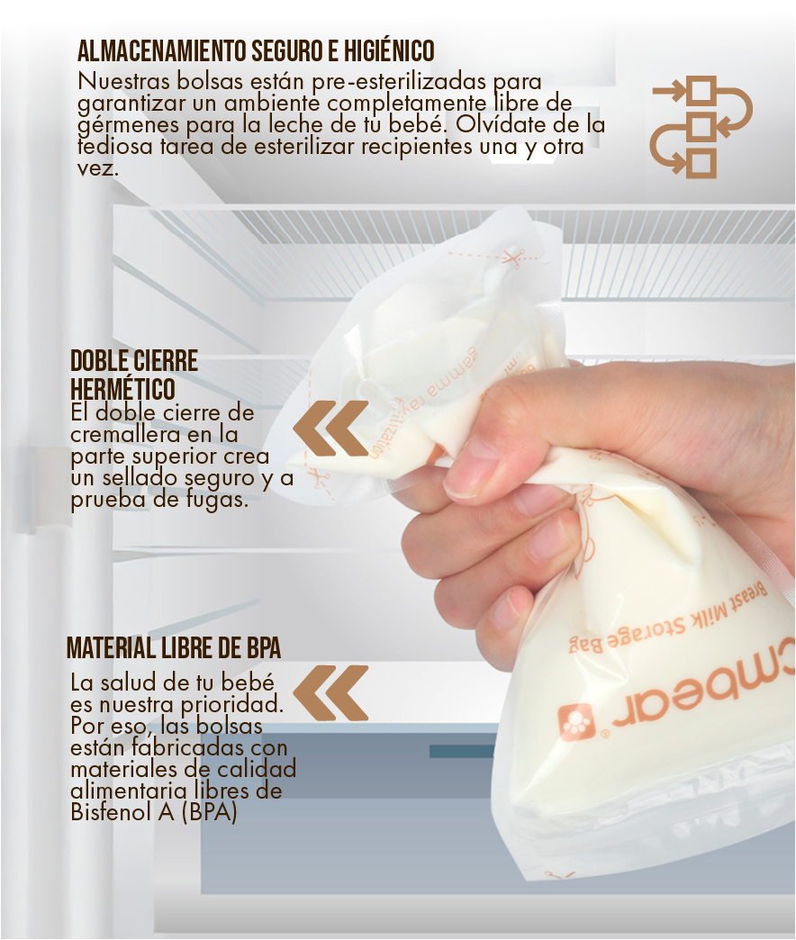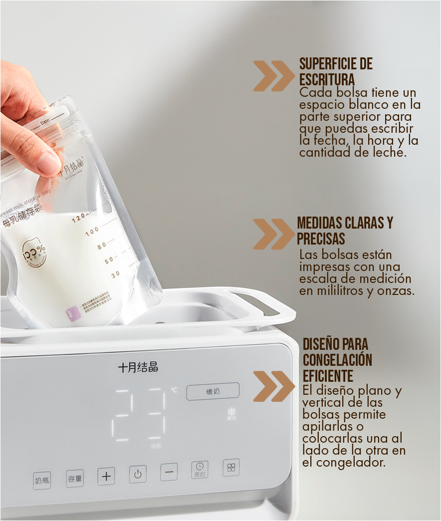 El espacio en el congelador es limitado, y las botellas voluminosas lo ocupan todo. Nuestras bolsas planas te permiten organizar y almacenar la leche de forma eficiente, liberando espacio para otros alimentos y eliminando el caos.