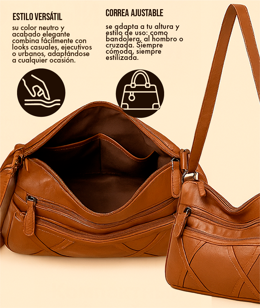 El peso mal distribuido puede causar dolor y fatiga. Pero ¿por qué sufrir? La correa ergonómica de nuestro bolso bandolera cuida de tu cuerpo. Es una caricia para tu hombro, un alivio para tu espalda. Es la comodidad que mereces en cada paso que das.