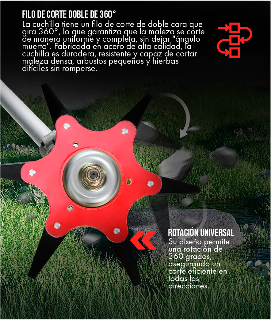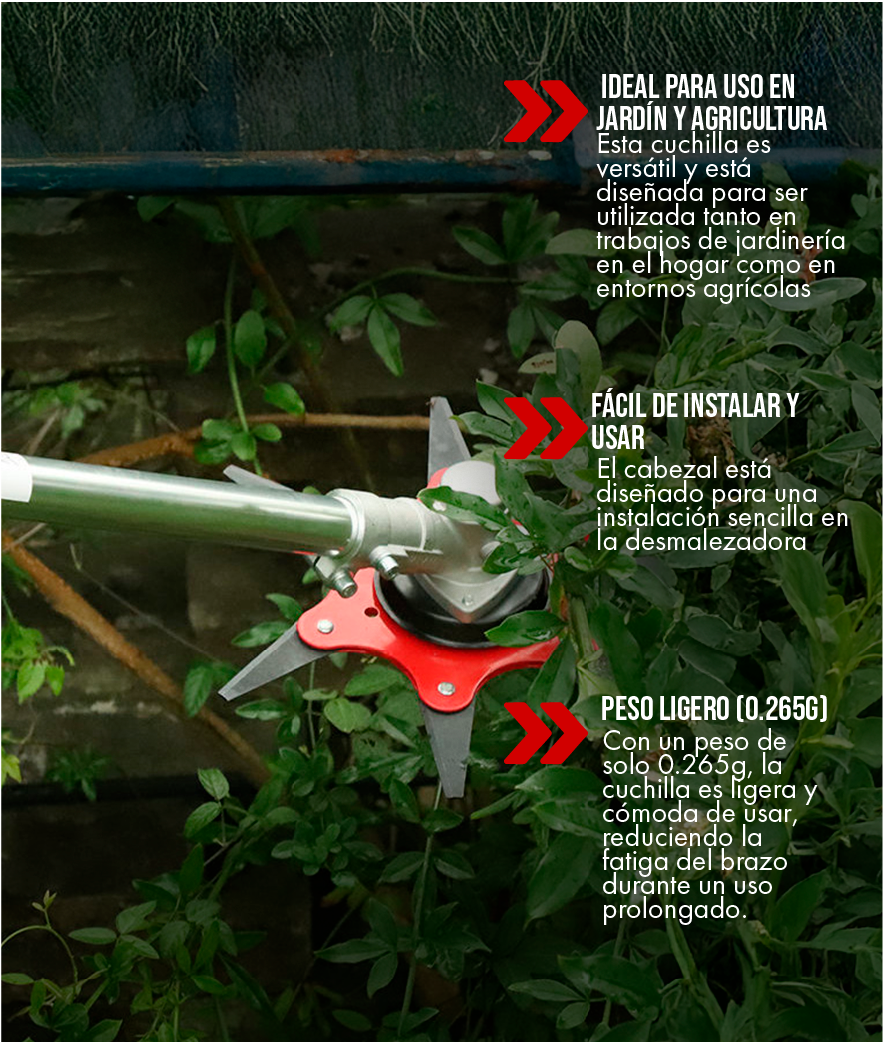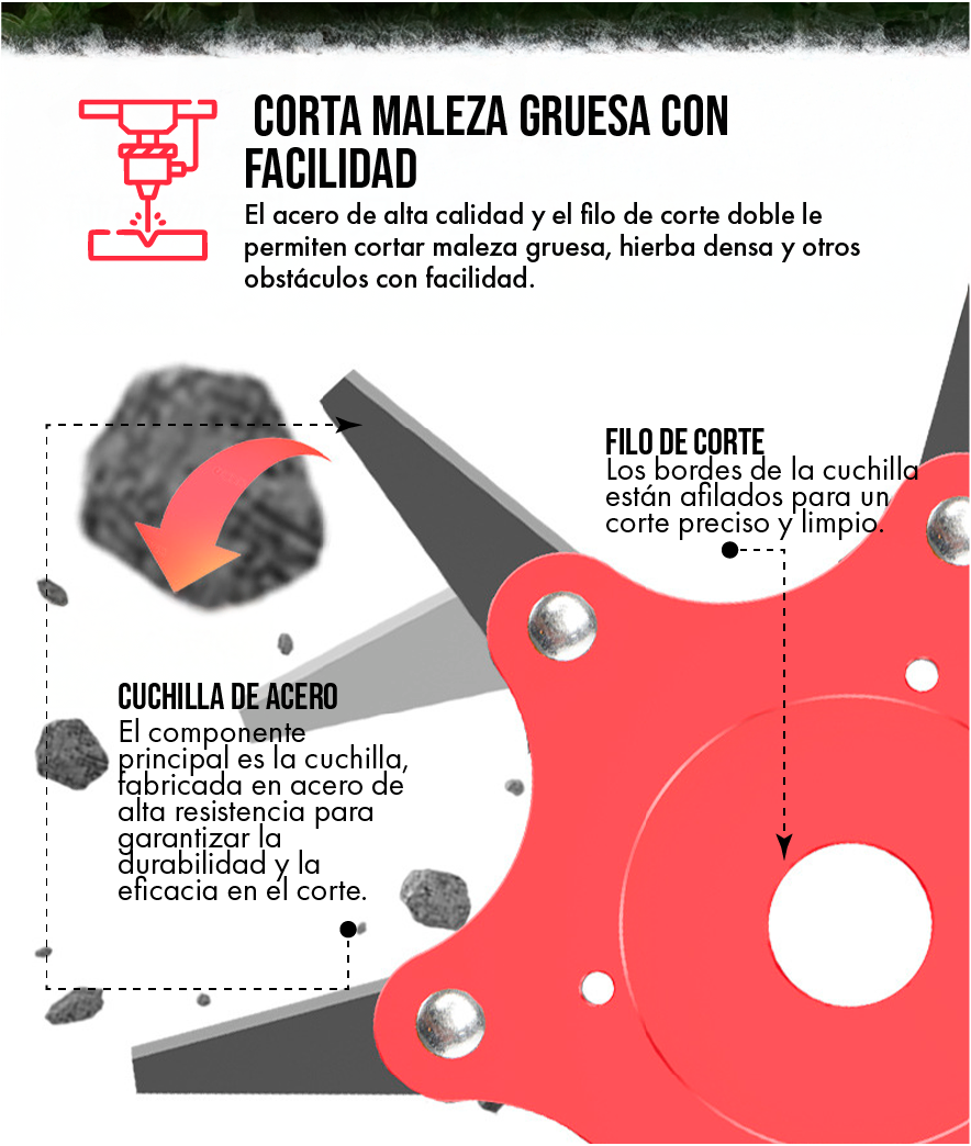 Imagina cortar a través de cualquier tipo de vegetación con una facilidad asombrosa. Con una herramienta que no se rinde, que corta limpiamente y que te permite terminar el trabajo en la mitad del tiempo. Siente el poder en tus manos.