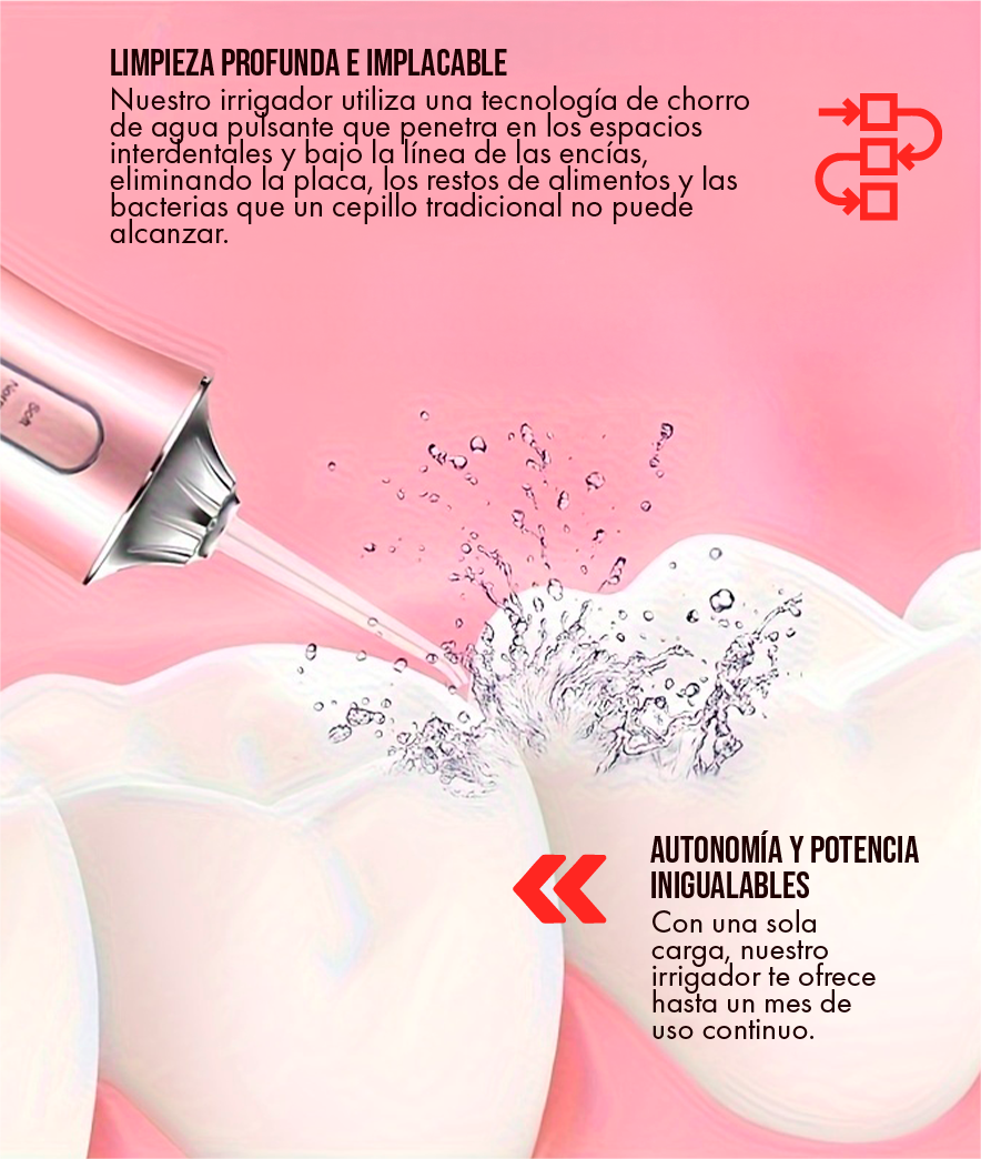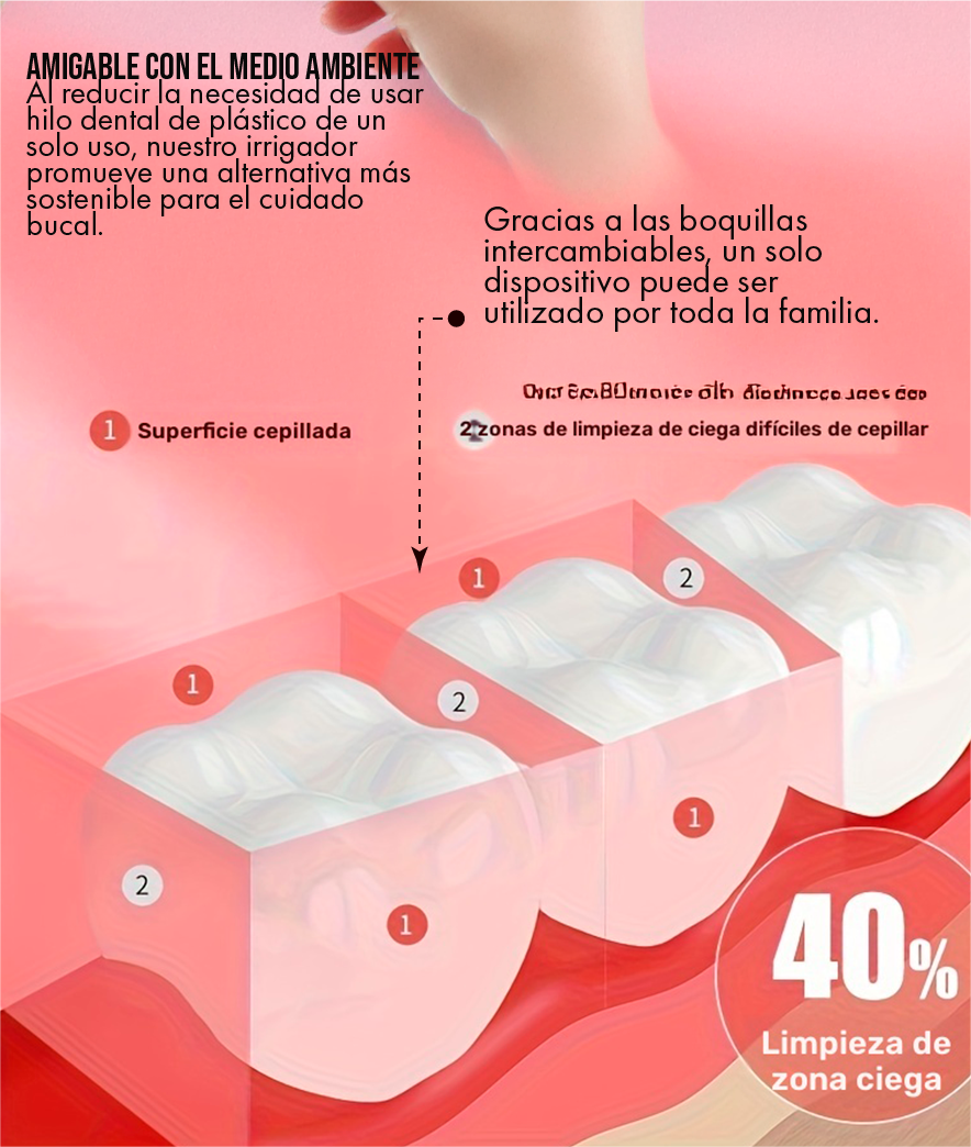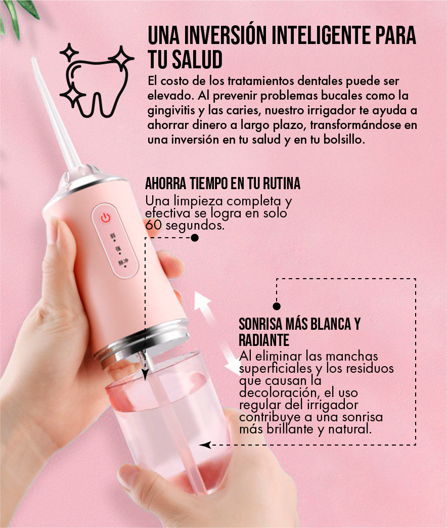 Olvídate del tedioso y complicado proceso de usar hilo dental. Nuestro irrigador simplifica tu rutina de higiene bucal, ofreciéndote resultados superiores en menos de un minuto. Libérate de la frustración y experimenta la facilidad de una limpieza profesional desde la comodidad de tu hogar.