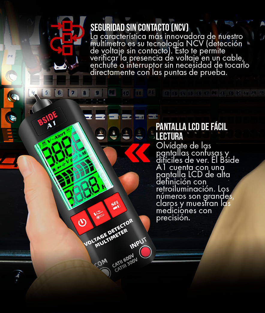 La luz de fondo de la pantalla te permite trabajar en los rincones más oscuros, como detrás de un electrodoméstico o dentro de un panel eléctrico, sin tener que usar una linterna.