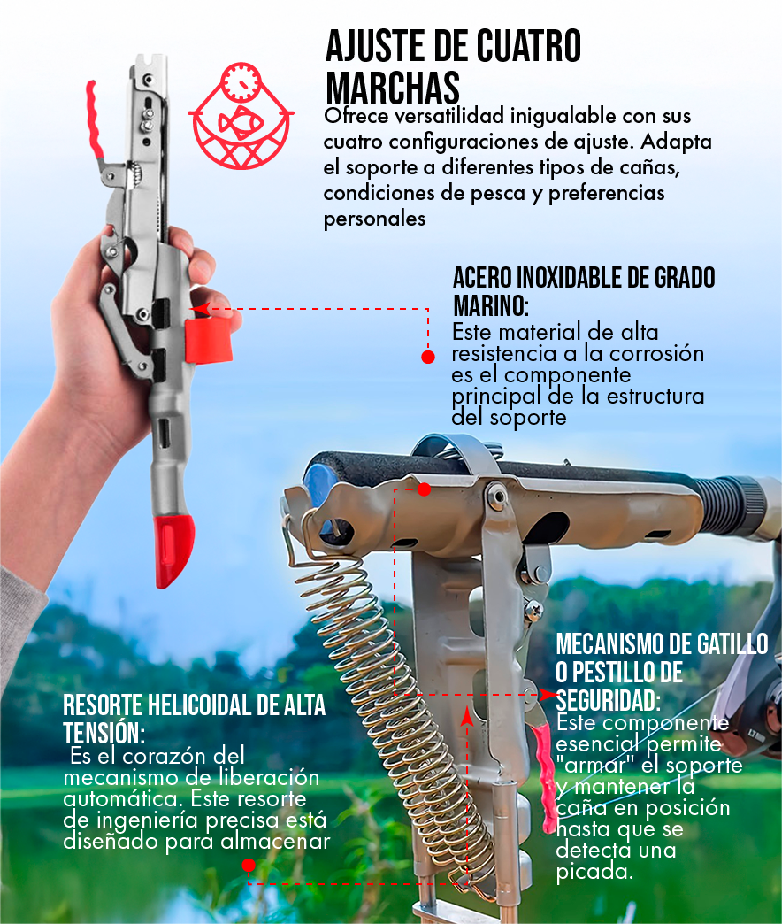 con su resorte de alta sensibilidad, no se te escapa ni la mordida más discreta. detecta de inmediato el movimiento del pez y acciona el mecanismo para que tú llegues a tiempo. esto significa menos oportunidades perdidas y más peces en tus manos.