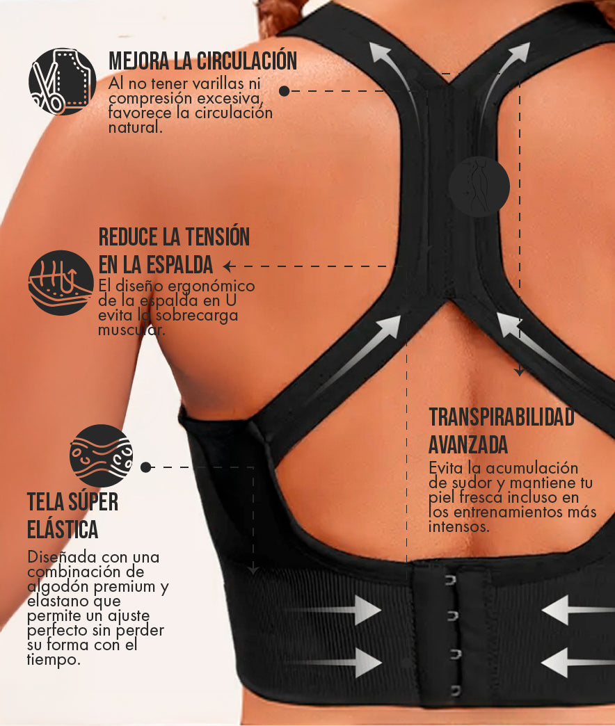 Mientras otros sujetadores se centran solo en el soporte frontal, nosotros pensamos en todo tu cuerpo. El diseño de nuestro sujetador mejora la circulación y reduce la tensión en tu espalda para que te sientas bien de pies a cabeza.