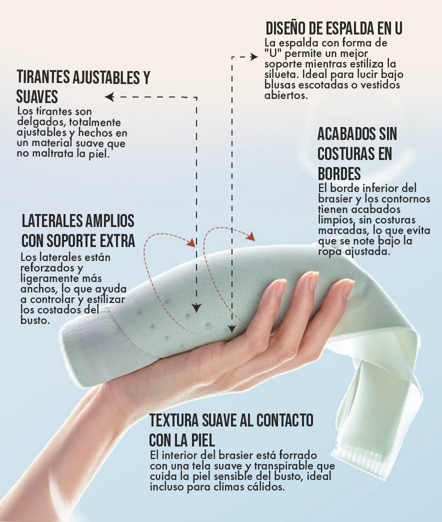 El dolor en los hombros y la espalda baja por el uso de un sujetador inadecuado es un problema real que afecta tu calidad de vida. Nuestro diseño ergonómico en U distribuye el peso de manera uniforme, aliviando la sobrecarga muscular y dándote la libertad de moverte sin dolor.