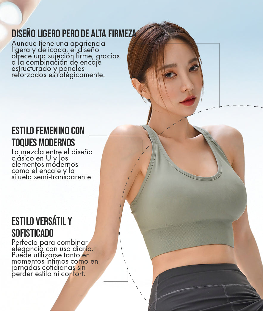 Olvídate de los sujetadores que te limitan. Nuestro diseño flexible te permite estirarte, doblarte y moverte en todas las direcciones con total confianza. Es el soporte que te sigue, no el que te detiene.