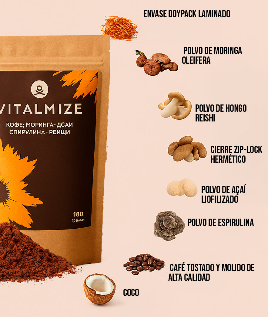 Café tostado y molido, Moringa, Acai Liofilizado, Hongo Reishi, Espirulina. |