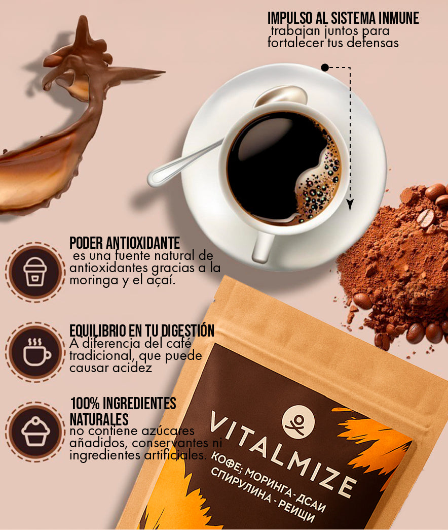 El café que compras en la tienda a menudo no te ofrece ningún beneficio más allá de la cafeína. Te preocupa que esté lleno de químicos y que no te esté nutriendo. Con Vitalcoffee, puedes tener la tranquilidad de que cada taza es un concentrado de superalimentos que nutren y protegen tu cuerpo, sin aditivos.